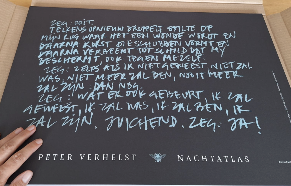 EEN AFFICHE MET EEN GEDICHTFRAGMENT UIT NACHTATLAS